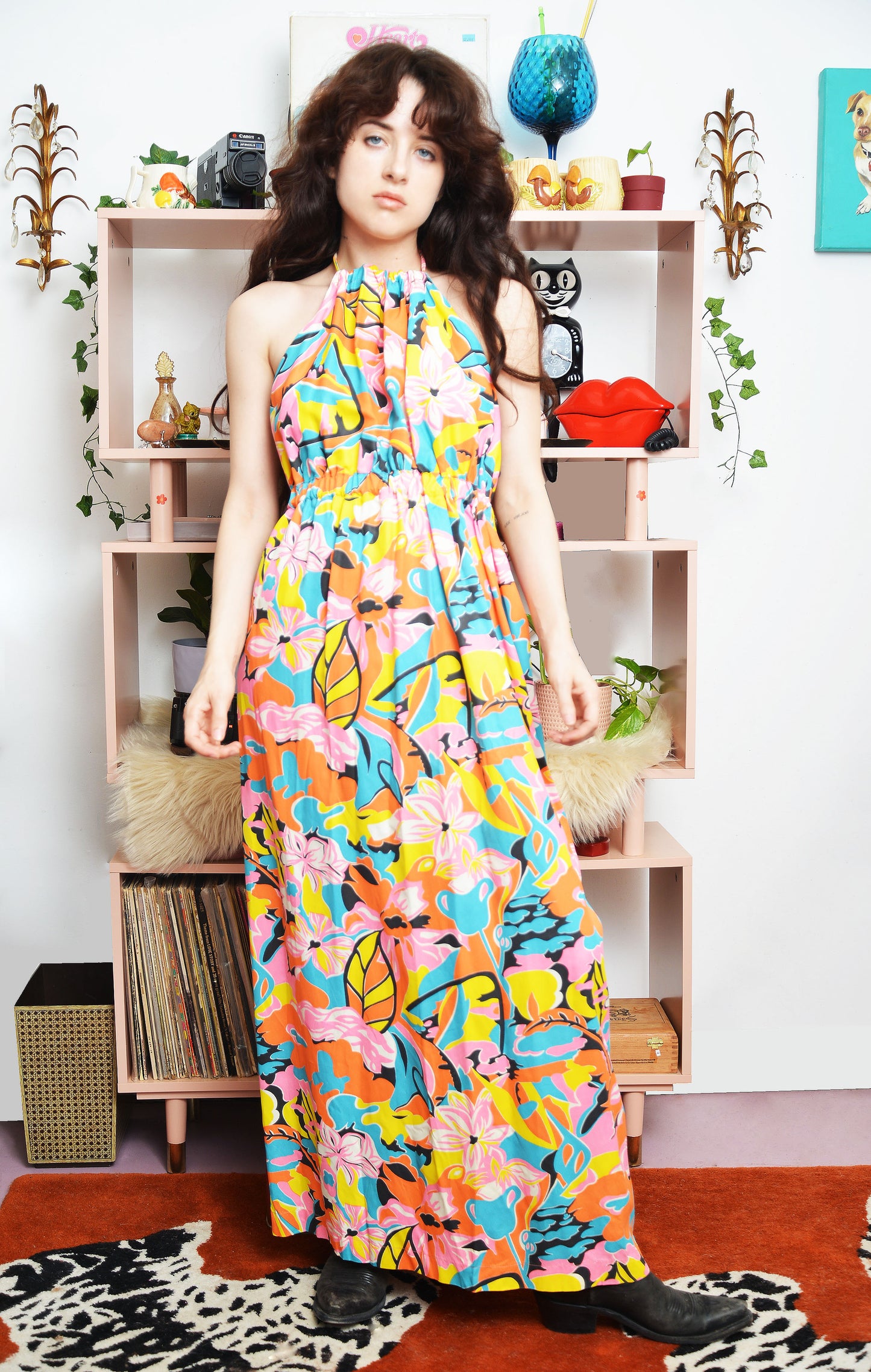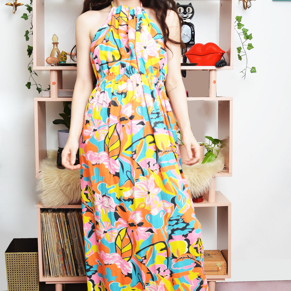 Vintage 1970s Hawaiian Print Halter Dress – Backless, Adjustable Tie – Floor-Length